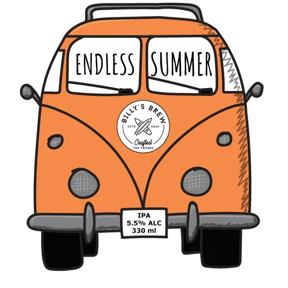 A printed design label for Billy’s Brew new IPA drink: Endless Summer.