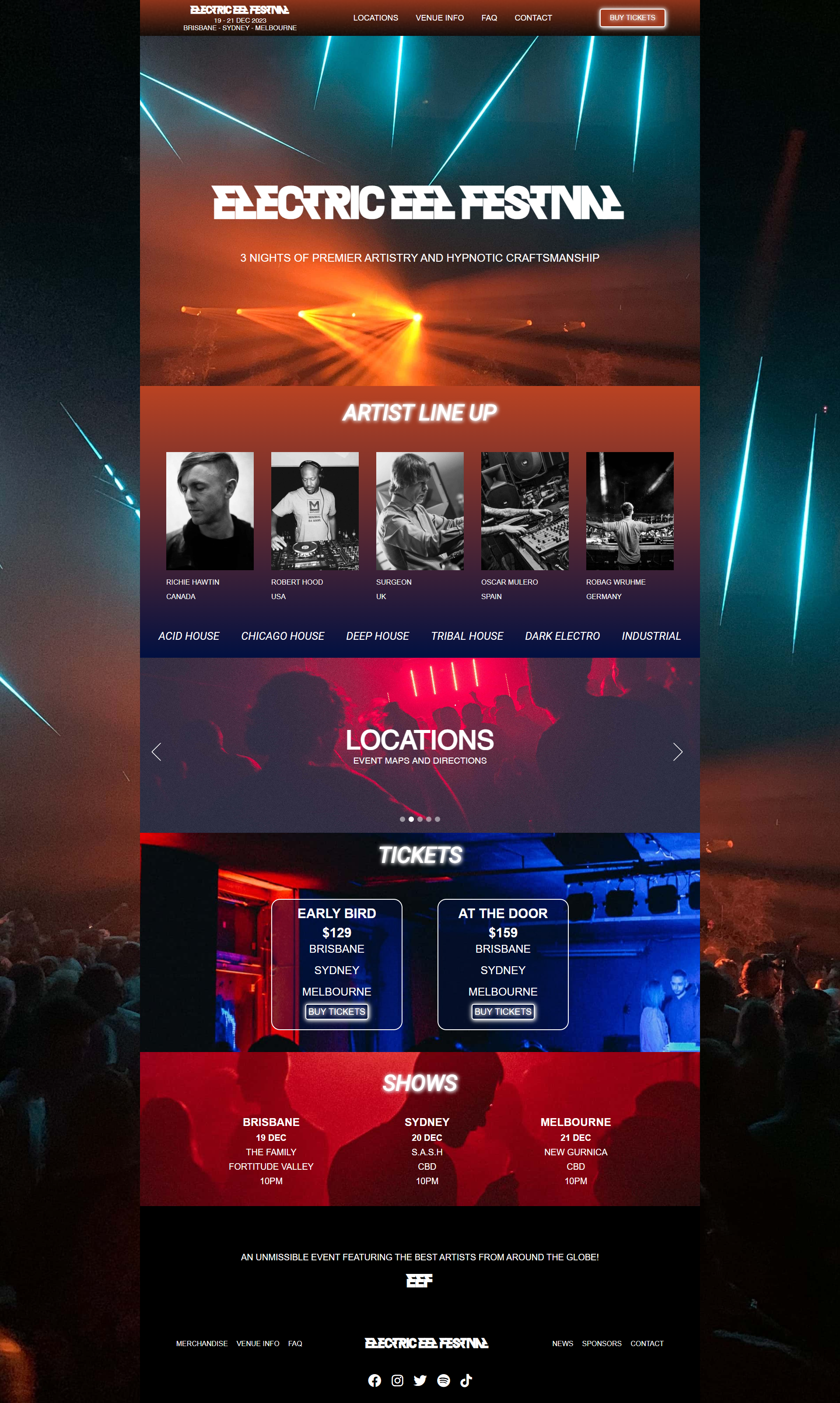 An interactive webpage that has been designed and coded for Electric Eel Festival using HTML, CSS and Javascript.